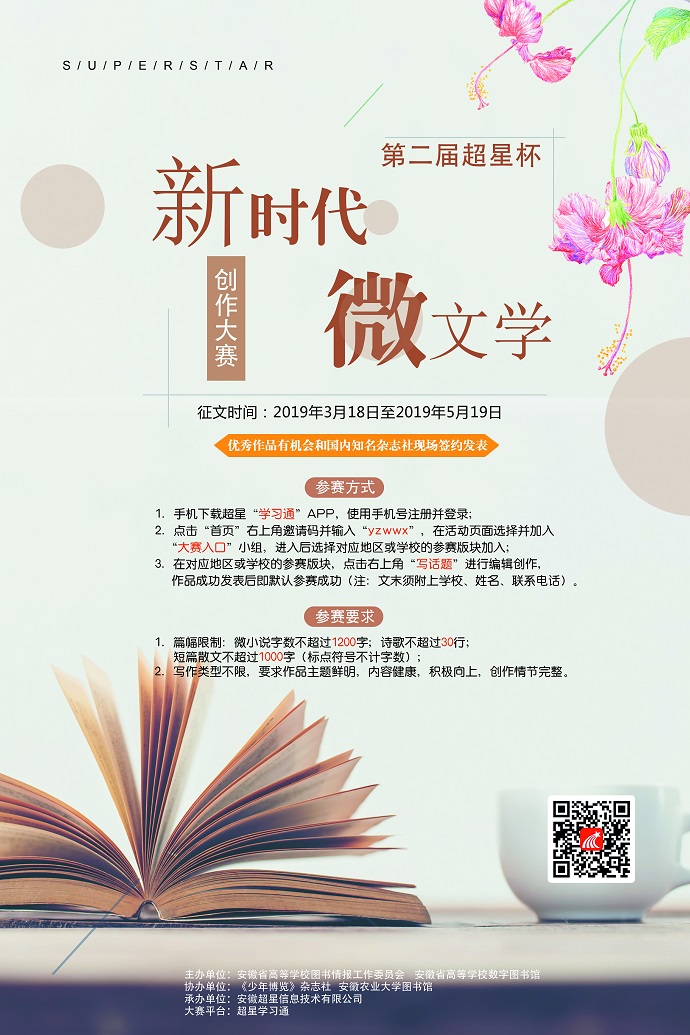 为了积极响应国家号召,推进“全民阅读”,打造书香社会,加强校园文化建设。由安徽省高等学校图书情报工作委员会、安徽省高等学校数字图书馆主办,《少年博览》杂志社、安徽农业大学图书馆协办开展第二届超星杯“新时代·微文学”创作大赛。