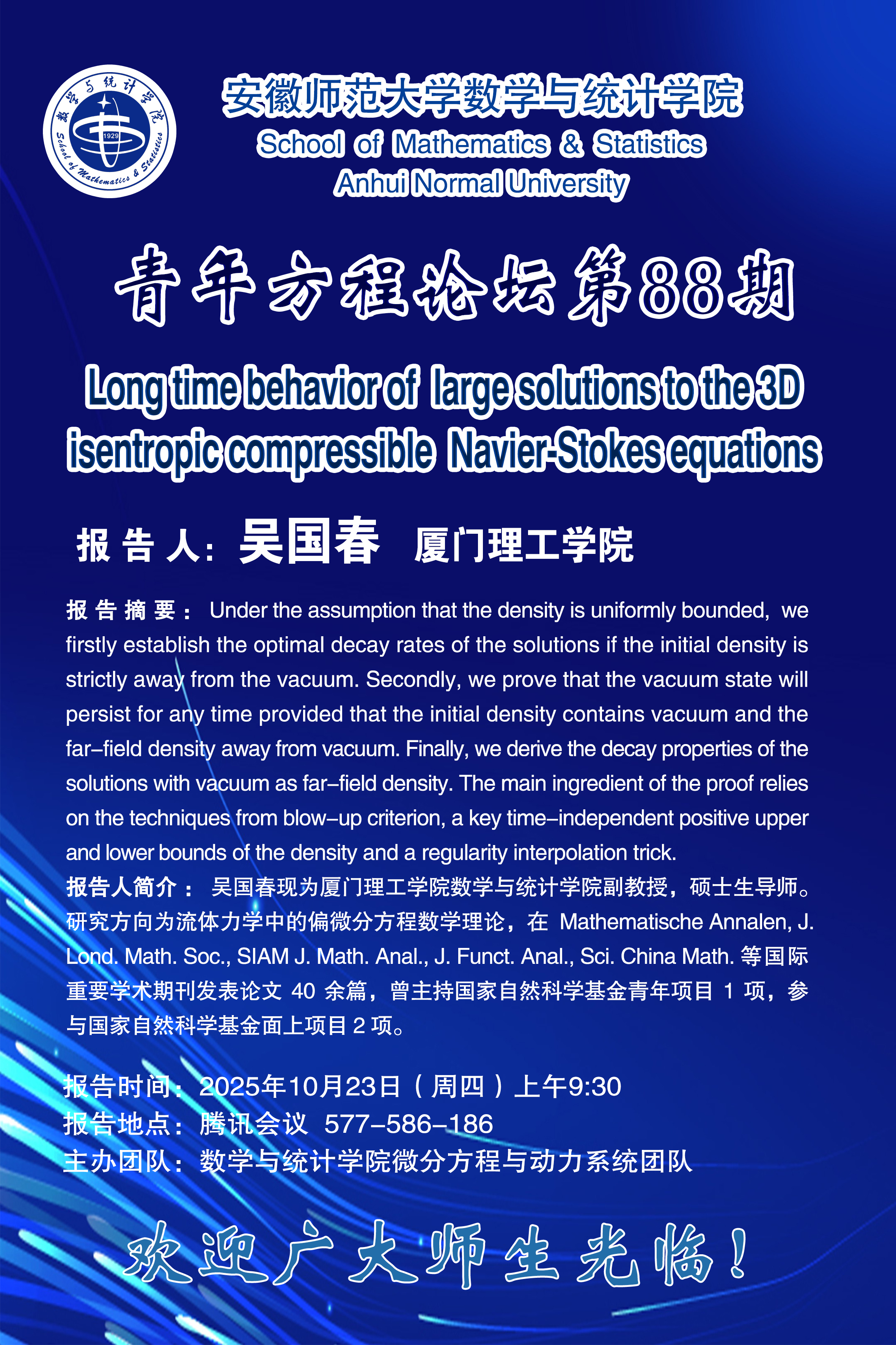 报告人 吴国春(厦门理工学院) 时间 2025年10月23日(周四)上午9:30