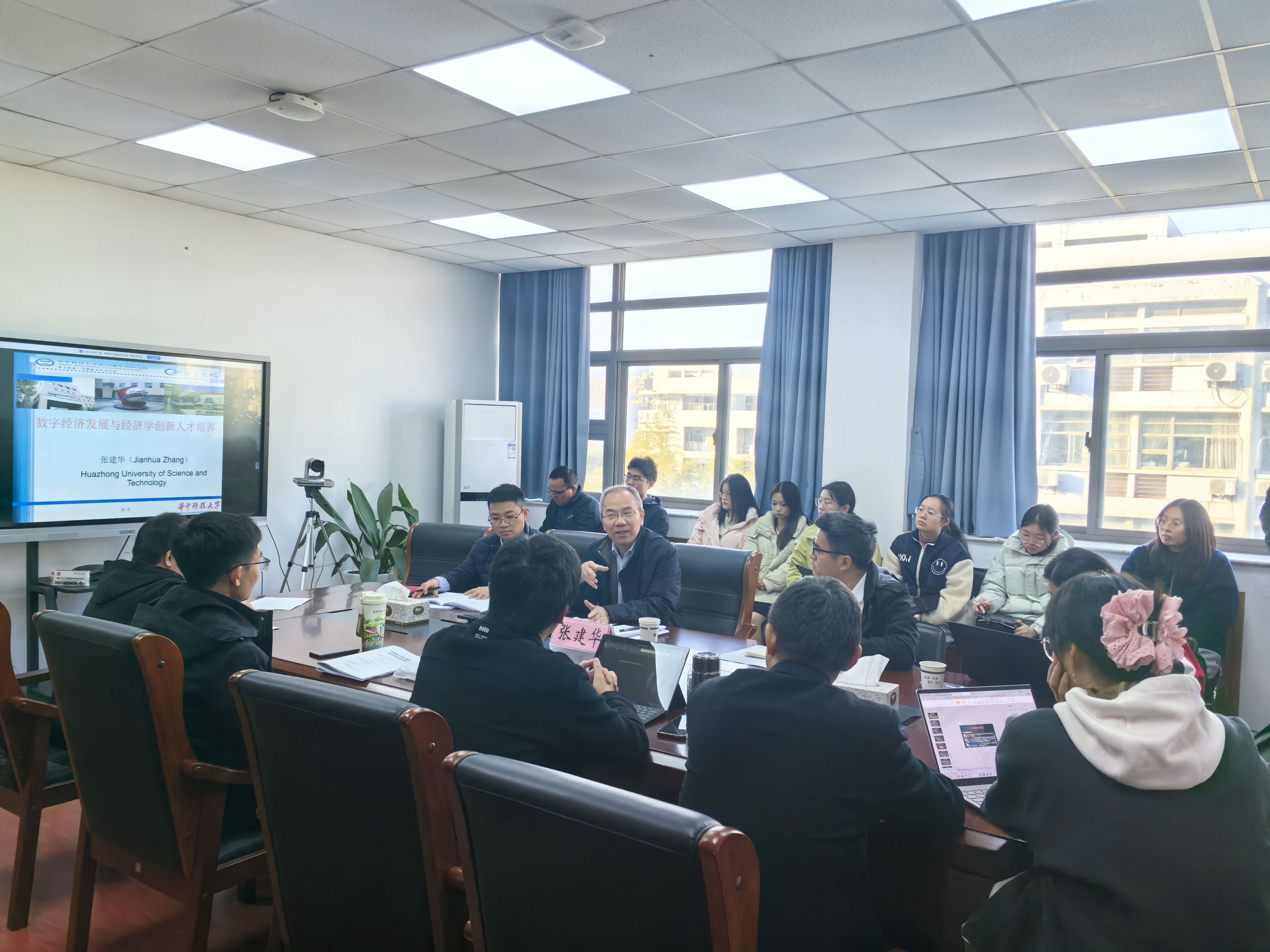 11月29日,华中科技大学经济学院院长、张培刚发展研究院院长张建华教授受邀来我校经管学院,作“数字经济发展与经济学创新人才培养”专题报告,指导数字经济交叉博士点创建工作。校发展规划部部长张廷龙与张建华进行了深入交流,经管学院院长马长伟、副院长徐飞,经济系、金融系、供应链管理系、数字经济系老师及研究生30余人参加交流活动。