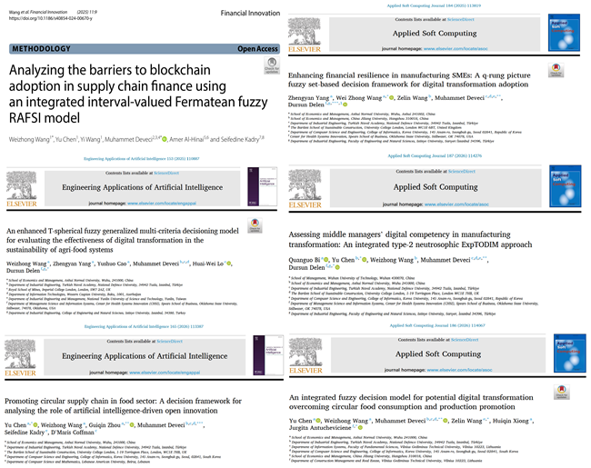 近日,经济管理学院汪伟忠副教授所指导的研究生团队聚焦数字化转型取得多项高水平研究成果。团队2023级工商管理学研究生陈雨、2024级工商管理学研究生杨正艳等作为主要作者(第一作者或通讯作者,或导师为第一作者),以安徽师范大学为第一单位或通讯单位,累计发表高水平学术论文6篇,其中ESI高被引论文1篇。相关研究成果发表于国际知名期刊《Financial innovation》(SSCI Q1, IF:7.5)、《Engineering Applications of Artificial Intelligence》(中科院一区TOP, IF:7.7)和《Applied Soft Computing》(中科院TOP期刊, IF: 6.9)。
