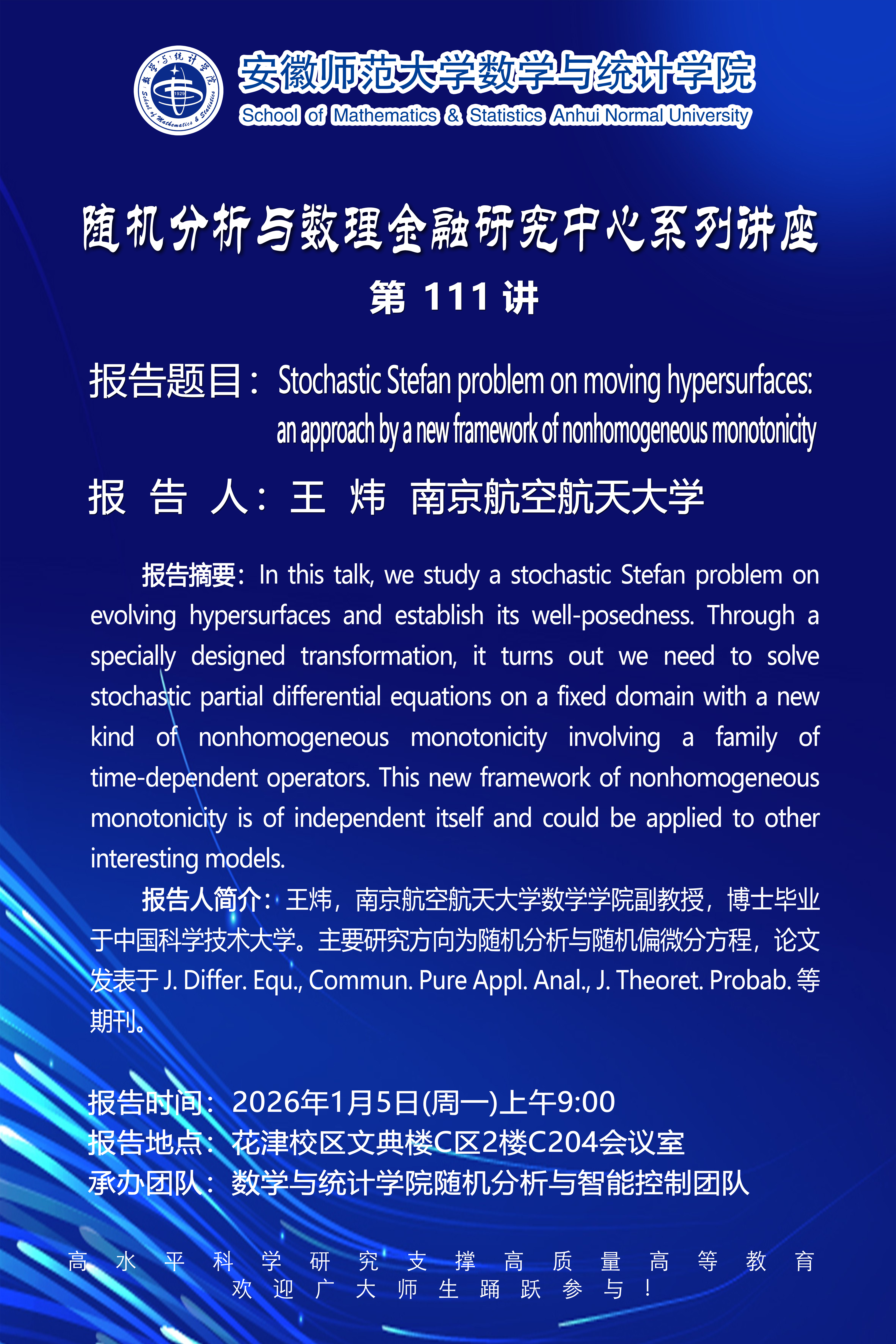 报告人 王炜(南京航空航天大学) 时间 2026年1月5日(周一)上午9:00