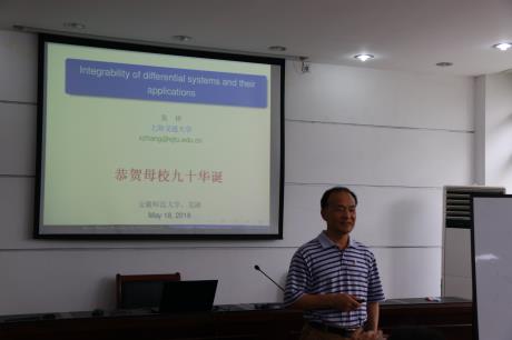 在报告会上,张祥教授报告的内容是微分系统的可积性及其应用的最新研究成果。张祥教授首先用引入一个关于第一积分的经典问题,介绍了可积性理论在数学问题上的应用;接着详细地阐明了达布多项式和不变代数超曲面,并且分析了达布可积性理论,包括在代数极限环上面的应用;最后阐述了可积性理论在代数几何、李群、微分和李曼几何,及拓扑学等方面的应用。