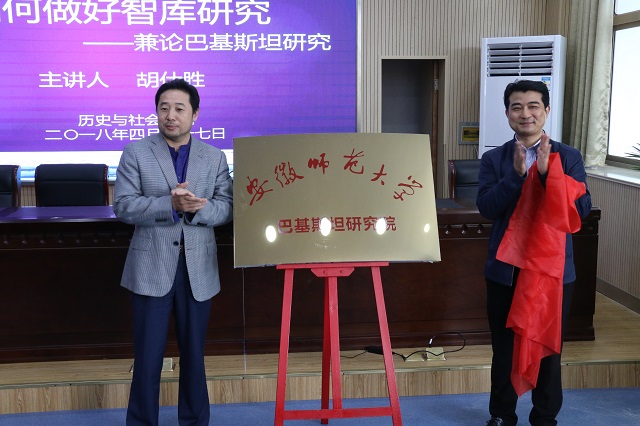 讲座开始前,胡仕胜所长与谭书龙副处长为学院成立的“安徽师范大学巴基斯坦研究院”揭牌,该研究院的成立,旨在聚焦地区国别史研究领域,推进我校世界史学科的特色建设。