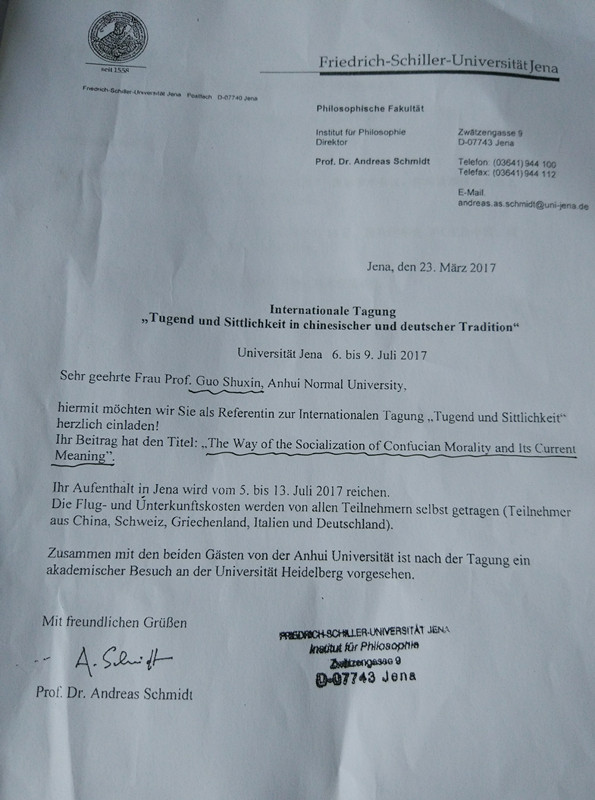 2017年7月7日至9日由耶拿大学、安徽师范大学、上海社会科学院、华东师范大学联合举办的“中德传统中的德行与伦理”国际学术会议在德国耶拿大学举行。来自中国、瑞士、希腊、意大利和德国的三十多位专家学者出席会议。学者们就中德、中西传统中的德行与伦理等相关问题进行了热烈讨论。