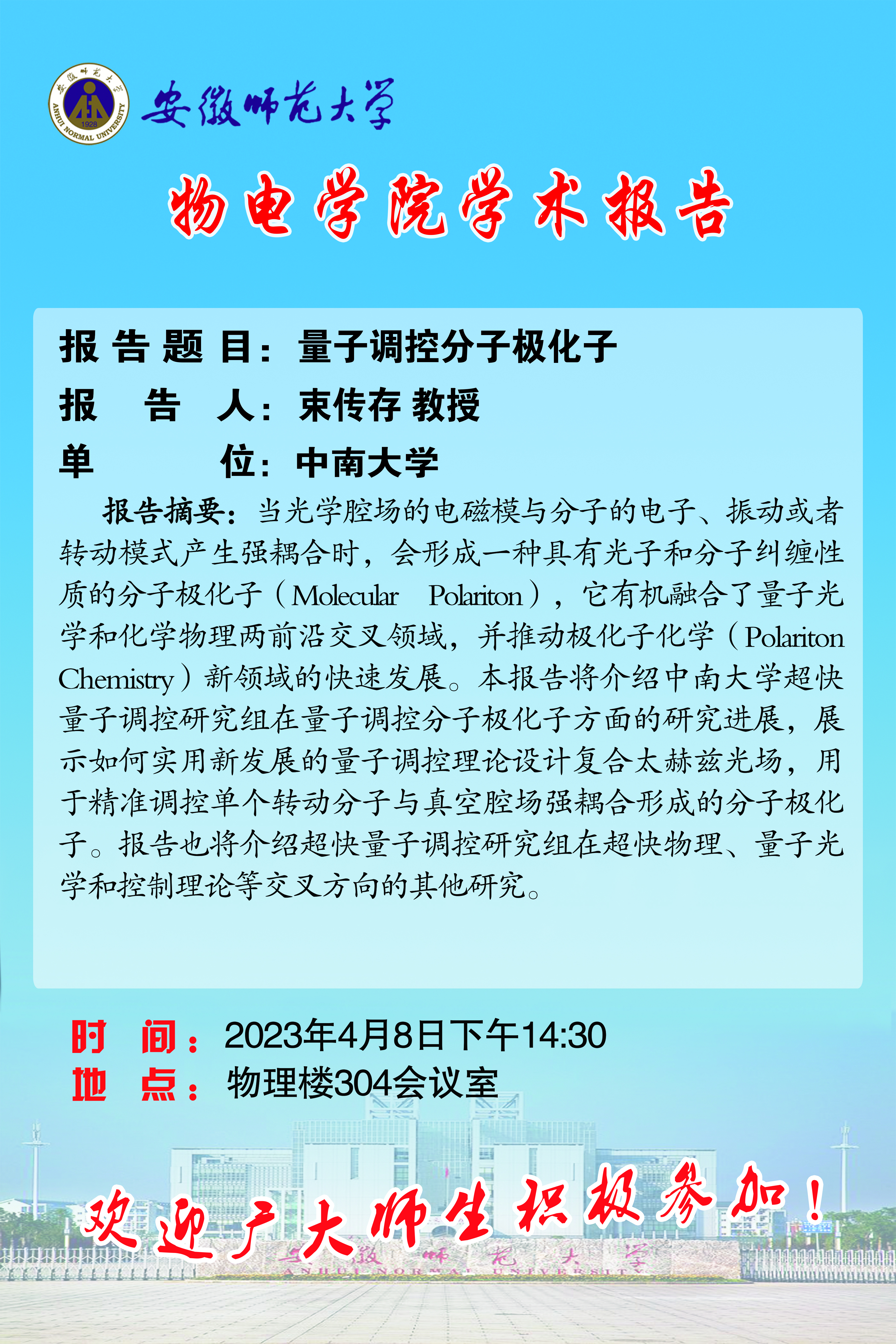 【学术预告·物电讲坛】束传存:量子调控分子极化子