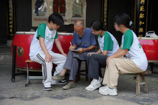 许传成向“三下乡”实践队员介绍磡头老鼓 今年暑假,安徽师范大学组建了597支团队,汇聚了超过11000名学生,深化“行走的思政课堂”实践育人项目,在实践中受教育、长才干、做贡献。实践团队们关注非遗文化,通过走访调研、专业实践和爱心支教等方式给非遗注入青年新力量,在实践中挖掘非遗精神,创新非遗传承新形式。