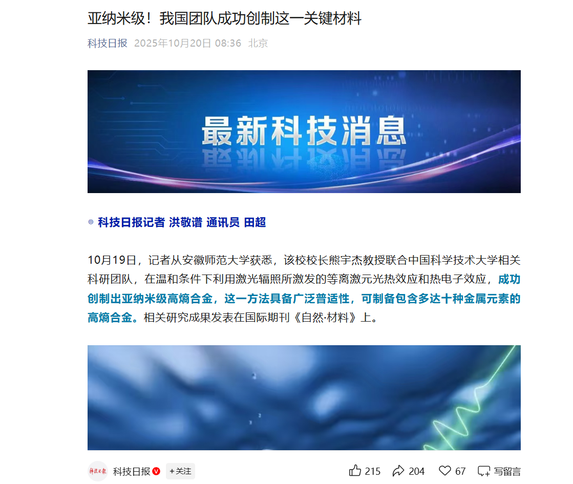 【振兴计划师大行】《自然·材料》刊登我校熊宇杰教授与合作者关于超稳定亚纳米高熵合金成果