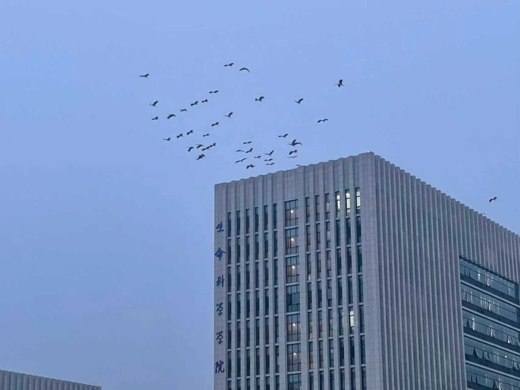 “在野外虽见过东方白鹳多次,但这么大规模的集群现身城市校园,还是较为罕见!”回忆起当时的场景,陈潘仍难掩激动。抬头望去,洁白羽翼在夕阳下泛着微光,长喙漆黑,47只东方白鹳组成的鸟群从东侧天际缓缓飞来,绕着清源楼划出优美弧线。作为深耕动物学的学者,他瞬间辨识出这一东亚特有濒危物种——被列入IUCN(世界自然保护联盟)红色目录的东方白鹳,对栖息环境的挑剔堪称“生态考官”。