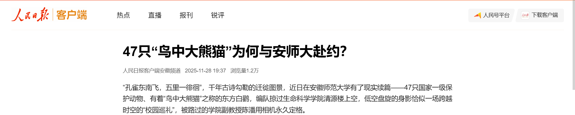 这场现代版“孔雀东南飞”——47只东方白鹳的短暂驻足,如同一次生态“体检”,照见了城市与校园的生态底色;而一位老师的专业敏锐、一个学院的科研积淀、一群学生的热情实践,则让这场偶遇超越了景观本身。在安徽师大,生态保护从来不是空洞的口号,而是课堂上的知识传递、校园里的日常观察、城市中的实践担当。当“鸟中大熊猫”愿意为这片土地驻足,当科研走出实验室、知识融入生活,人与自然和谐共生的美好图景,正在这座校园里徐徐展开。(文/茅文颖、图/陈潘)
