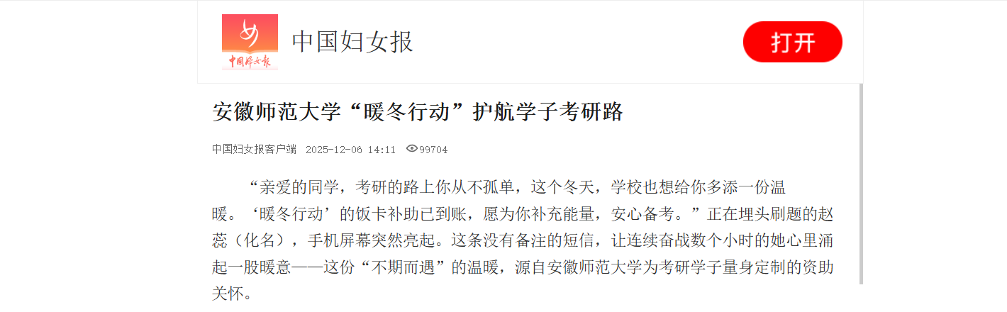 “亲爱的同学,考研的路上你从不孤单,这个冬天,学校也想给你多添一份温暖。‘暖冬行动’的饭卡补助已到账,愿为你补充能量,安心备考。”正在埋头刷题的赵蕊(化名),手机屏幕突然亮起。这条没有备注的短信,让连续奋战数个小时的她心里涌起一股暖意——这份“不期而遇”的温暖,源自安徽师范大学为考研学子量身定制的资助关怀。