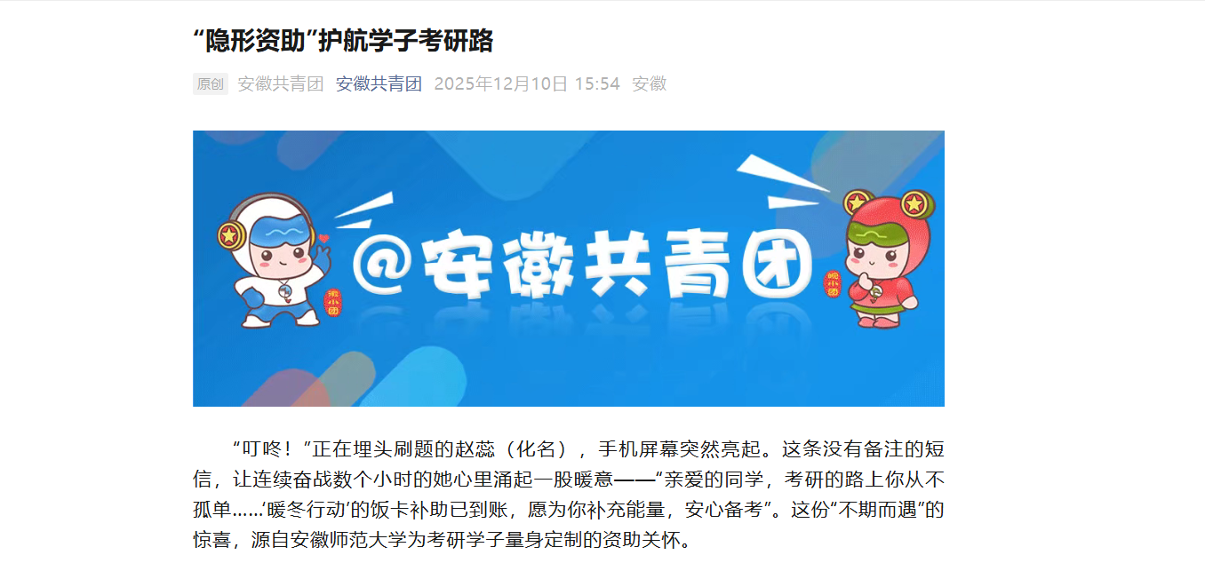 “叮咚!”正在埋头刷题的赵蕊(化名),手机屏幕突然亮起。这条没有备注的短信,让连续奋战数个小时的她心里涌起一股暖意——“亲爱的同学,考研的路上你从不孤单……‘暖冬行动’的饭卡补助已到账,愿为你补充能量,安心备考”。这份“不期而遇”的惊喜,源自安徽师范大学为考研学子量身定制的资助关怀。