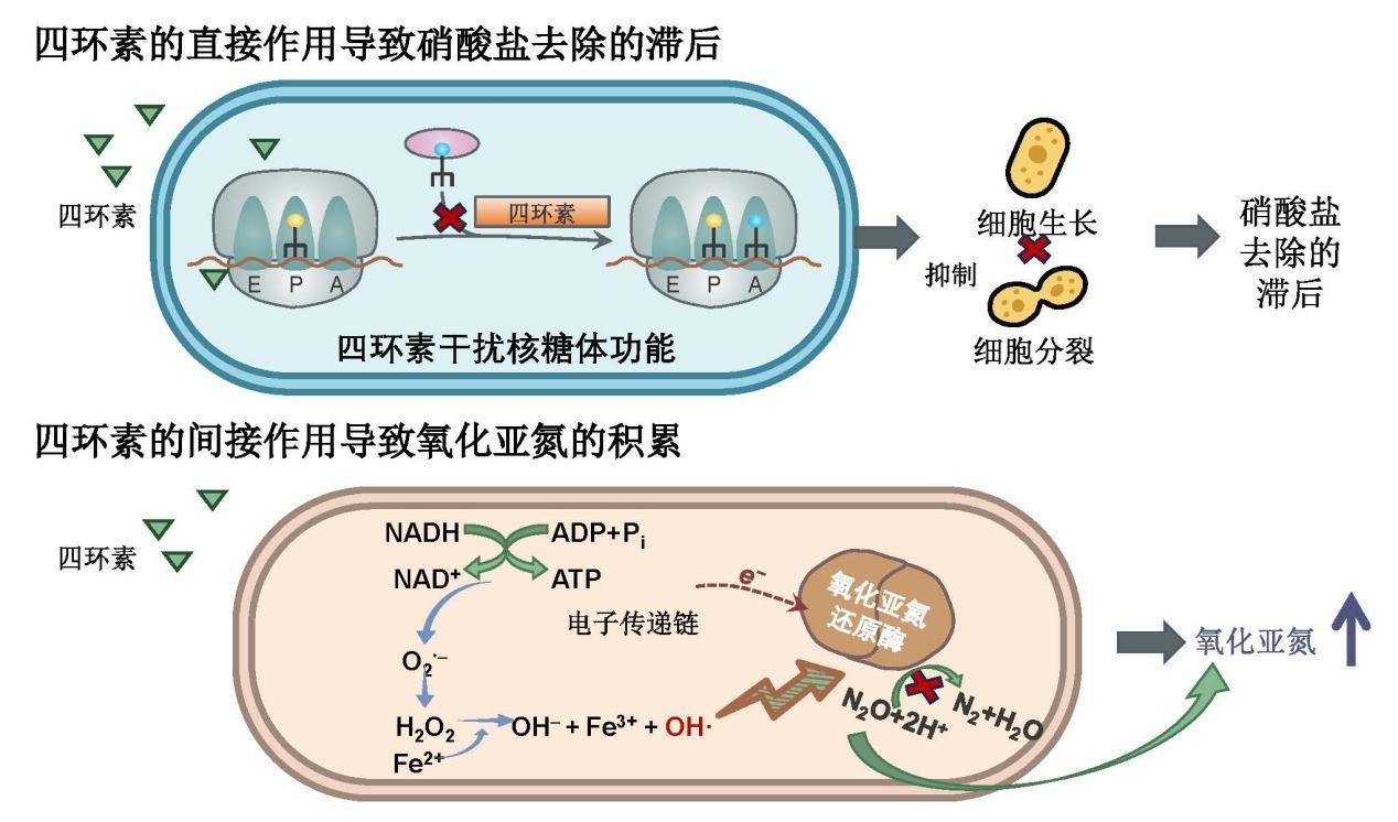 研究团队以典型反硝化细菌为对象,模拟环境中常见浓度的四环素类抗生素暴露情况。结果发现,即使在不足以杀死细胞的低浓度下,抗生素仍能显著延缓硝酸盐的去除过程,并大幅增加氧化亚氮排放。通过酶活测定、细胞生理与转录组学分析,研究团队发现抗生素通过抑制蛋白质合成、干扰葡萄糖代谢与电子传递,导致细胞内部氧化还原失衡和活性氧积累,进而优先抑制了还原氧化亚氮的酶活性,造成氧化亚氮积累。