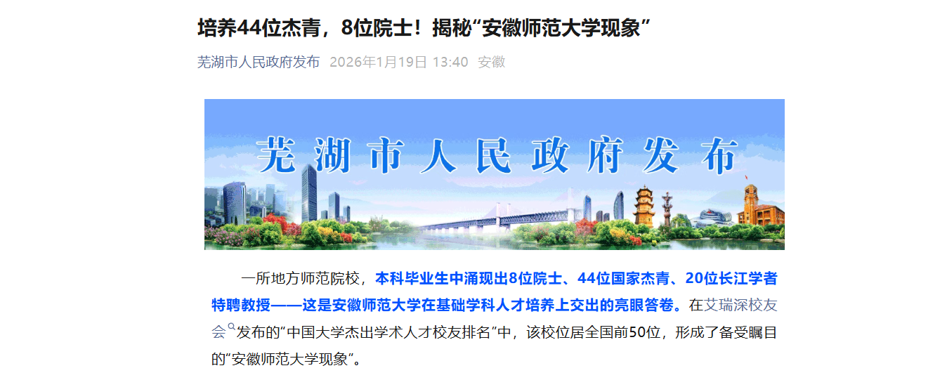 一所地方师范院校,本科毕业生中涌现出8位院士、44位国家杰青、20位长江学者特聘教授——这是安徽师范大学在基础学科人才培养上交出的亮眼答卷。在艾瑞深校友会发布的“中国大学杰出学术人才校友排名”中,该校位居全国前50位,形成了备受瞩目的“安徽师范大学现象”。