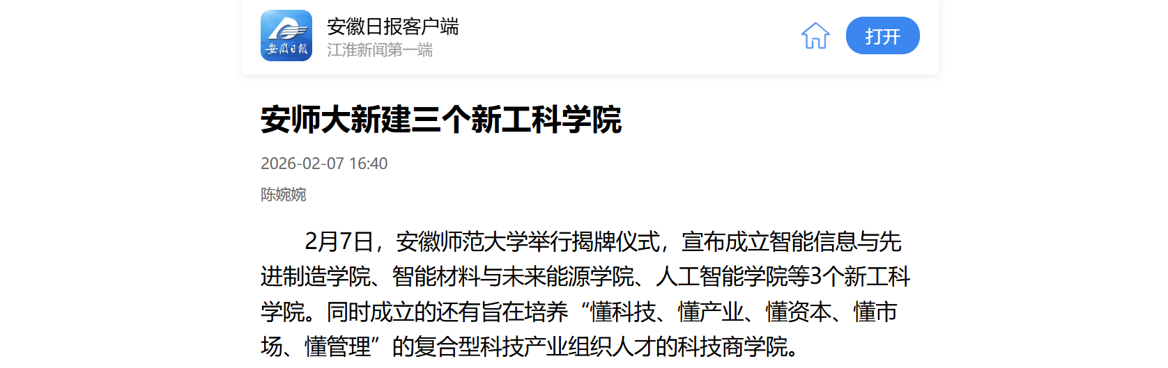 2月7日,安徽师范大学举行揭牌仪式,宣布成立智能信息与先进制造学院、智能材料与未来能源学院、人工智能学院等3个新工科学院。同时成立的还有旨在培养“懂科技、懂产业、懂资本、懂市场、懂管理”的复合型科技产业组织人才的科技商学院。