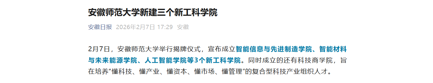 2月7日,安徽师范大学举行揭牌仪式,宣布成立智能信息与先进制造学院、智能材料与未来能源学院、人工智能学院等3个新工科学院。同时成立的还有旨在培养“懂科技、懂产业、懂资本、懂市场、懂管理”的复合型科技产业组织人才的科技商学院。