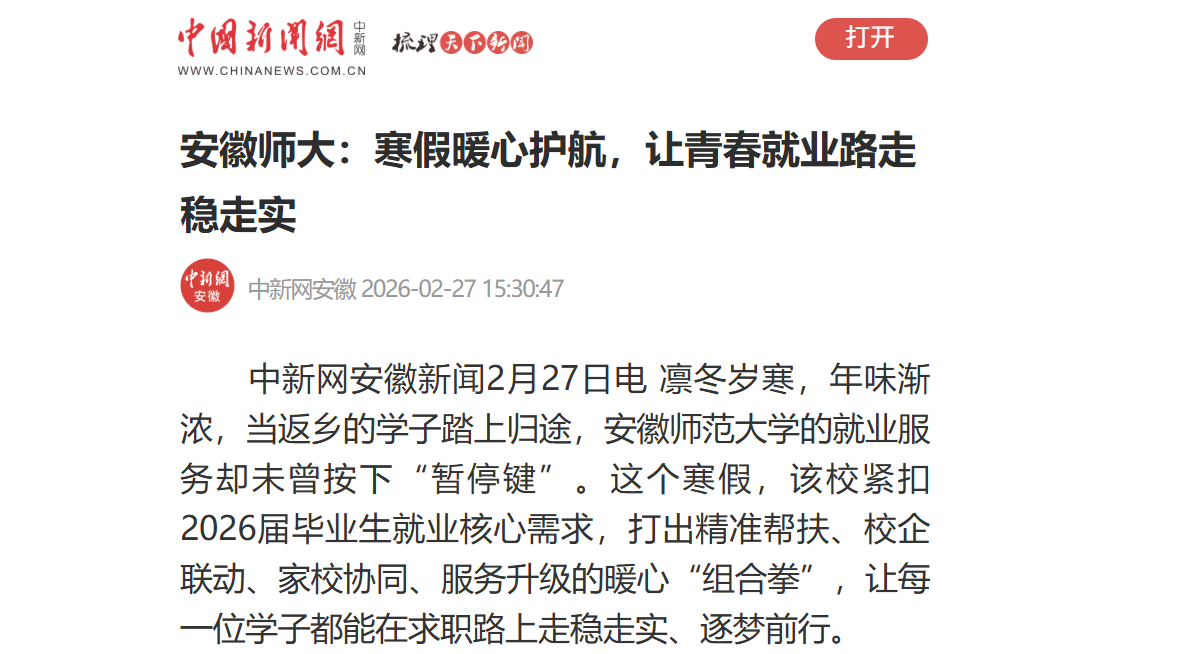 一封暖心信,传递学校牵挂;一场云招聘,搭建求职桥梁;一次一对一帮扶,点亮前行希望……下一步,安徽师大将持续巩固寒假促就业暖心行动成效,紧盯毕业生就业关键节点,深挖岗位资源、强化精准服务、优化就业指导,以更实的举措、更暖的服务全力推动2026届毕业生更高质量、更充分就业。
