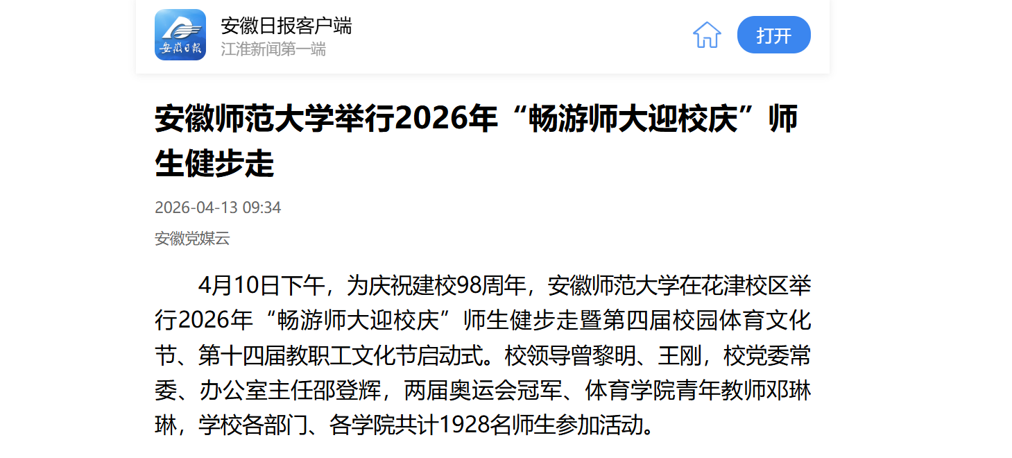 4月10日下午,为庆祝建校98周年,安徽师范大学在花津校区举行2026年“畅游师大迎校庆”师生健步走暨第四届校园体育文化节、第十四届教职工文化节启动式。校领导曾黎明、王刚,校党委常委、办公室主任邵登辉,两届奥运会冠军、体育学院青年教师邓琳琳,学校各部门、各学院共计1928名师生参加活动。