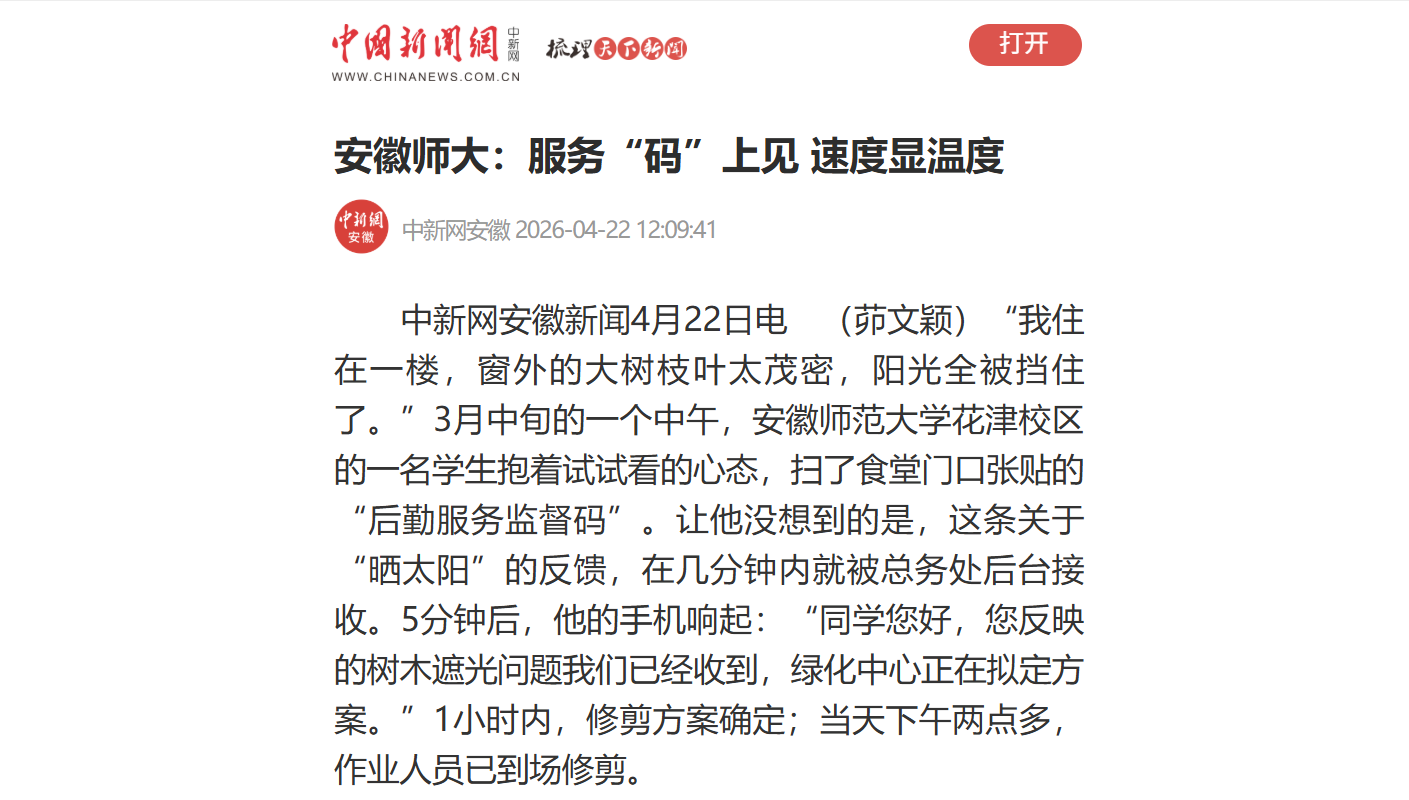 我住在一楼,窗外的大树枝叶太茂密,阳光全被挡住了。”3月中旬的一个中午,安徽师范大学花津校区的一名学生抱着试试看的心态,扫了食堂门口张贴的“后勤服务监督码”。让他没想到的是,这条关于“晒太阳”的反馈,在几分钟内就被总务处后台接收。5分钟后,他的手机响起:“同学您好,您反映的树木遮光问题我们已经收到,绿化中心正在拟定方案。”1小时内,修剪方案确定;当天下午两点多,作业人员已到场修剪。