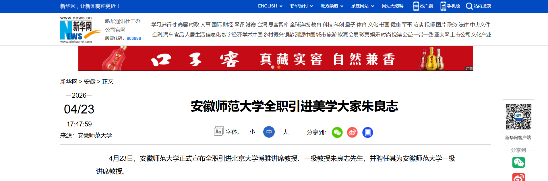 4月23日,安徽师范大学正式宣布全职引进北京大学博雅讲席教授、一级教授朱良志先生,并聘任其为安徽师范大学一级讲席教授。
