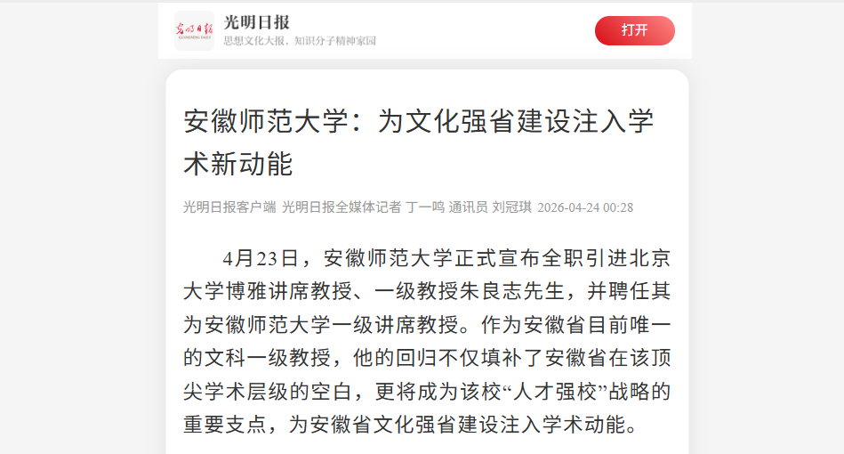 4月23日,安徽师范大学正式宣布全职引进北京大学博雅讲席教授、一级教授朱良志先生,并聘任其为安徽师范大学一级讲席教授。作为安徽省目前唯一的文科一级教授,他的回归不仅填补了安徽省在该顶尖学术层级的空白,更将成为该校“人才强校”战略的重要支点,为安徽省文化强省建设注入学术动能。
