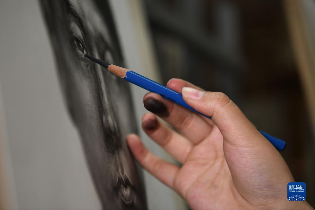 安徽师范大学的大学生李辰宇在为烈士画像。新华社记者 张端 摄