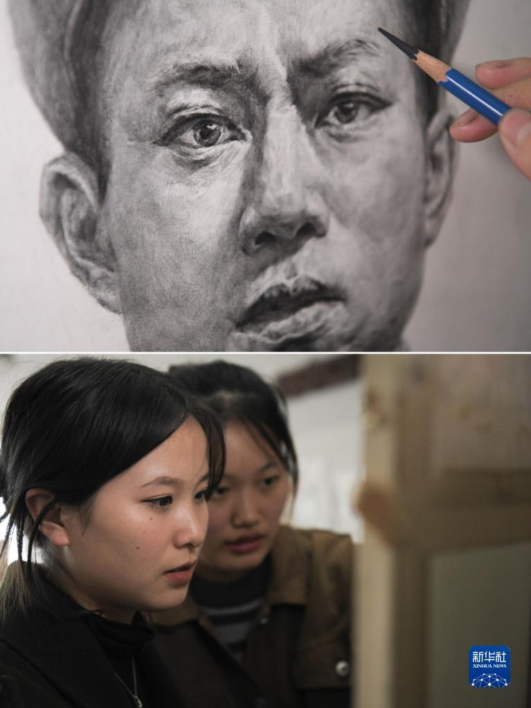 上图是安徽师范大学的“00后”大学生胡守莹画的烈士画像;下图为胡守莹(前)为烈士画像(新华社记者 张端 摄)