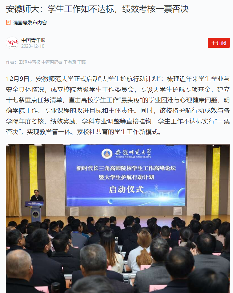 12月9日,安徽师范大学正式启动“大学生护航行动计划”:梳理近年来学生学业与安全具体情况,成立校院两级学生工作委员会,专设大学生护航专项基金,建立十七条重点任务清单,直击高校学生工作“最头疼”的学业困难与心理健康问题,明确学院工作、专业课程的改进目标和主体责任。同时,该校将护航行动成效与各学院年度考核、绩效奖励、学科专业调整等直接挂钩,学生工作不达标实行“一票否决”,实现教学管一体、家校社共育的学生工作新模式。