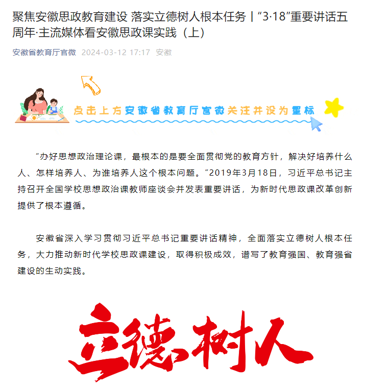 【安徽省教育厅官微】聚焦安徽思政教育建设 落实立德树人根本任务丨“3·18”重要讲话五周年·主流媒体看安徽思政课实践(上)