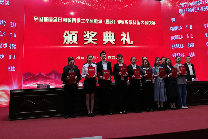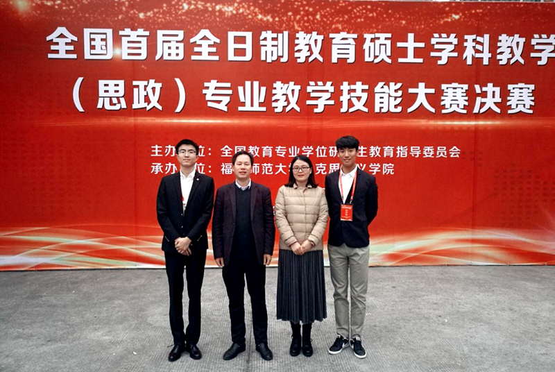 本网讯(马克思主义学院) 11月21日至23日,由全国教育专业学位研究生教育指导委员会主办、福建师范大学承办的首届全国全日制教育硕士学科教学(思政)专业教学技能大赛(决赛)在福州成功举办。本次赛事是为了进一步展示全日制教育硕士的培养成果,促进院校之间的相互交流,不断提高学科教学(思政)专业教育硕士研究生的培养质量。来自北京师范大学、东北师范大学、华东师范大学、华中师范大学、华南师范大学等44所高校的62位优秀硕士生参加了决赛。