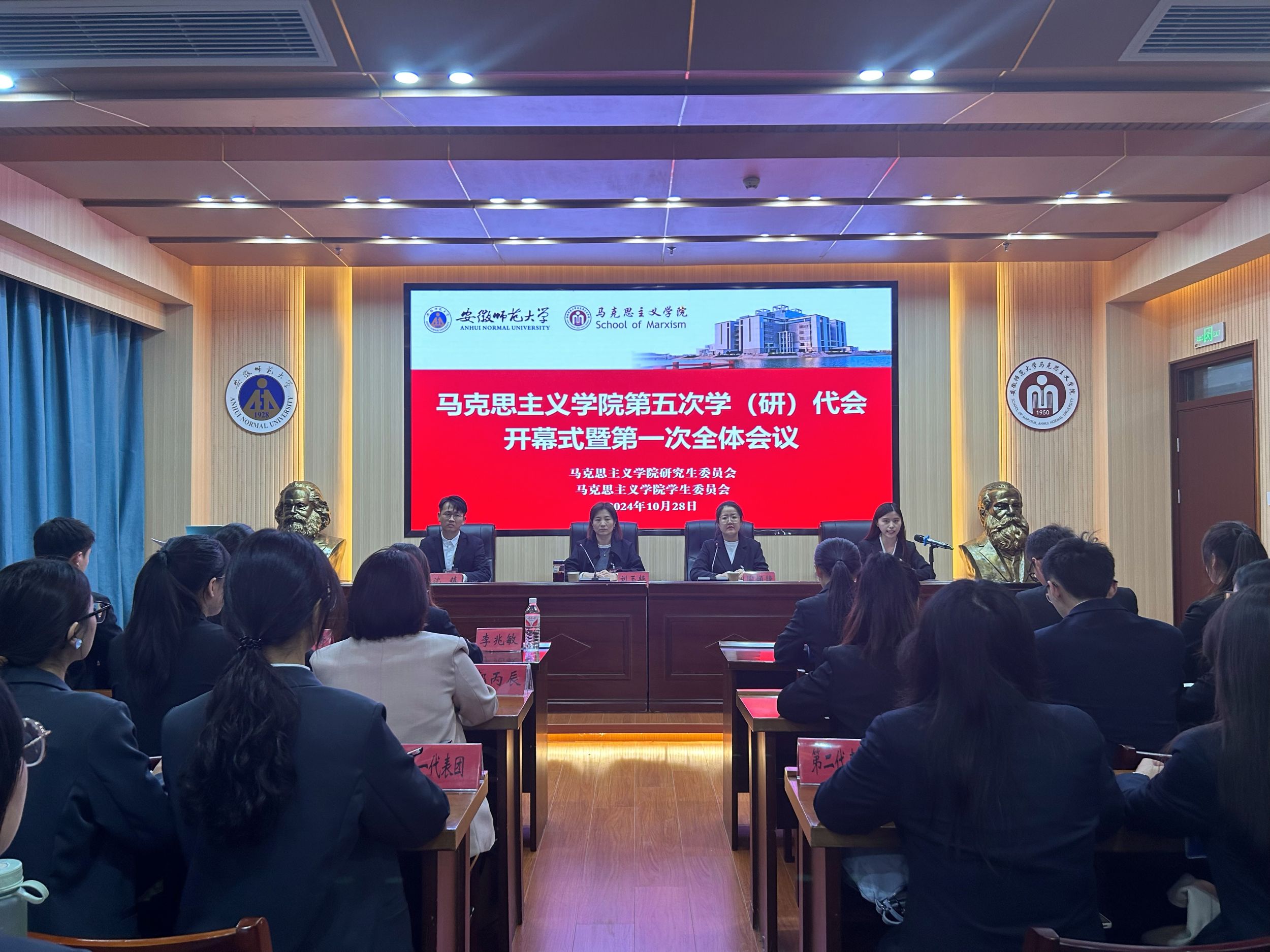 正式会议在庄严的国歌声中拉开帷幕。在开幕式暨第一次全体会议中,刘玉艳为大会致开幕词。她对大会的召开表示热烈的祝贺,对过去一年学生会和研究生会的工作给予肯定,并向广大青年学生提出殷切希望:新时代青年要在政治自觉中找准方向;在历史自觉中贡献力量;在文化自觉中成长进步;在行动自觉中淬炼品格,将个人命运与国家命运紧密相连,与祖国同呼吸、共理想、齐奋进。随后,学院学生会主席团成员李兆敏、研究生会主席团成员叶倩分别对过去一年的学生会和研究生会的工作进行了报告。大会第二次会议通过了《安徽师范大学马克思主义学院出席校学(研)代会代表选举办法》、《安徽师范大学马克思主义学院第五届学生会(研究生会)主席团、学生(研究生)委员会委员选举办法》等系列草案,并选举出学院参加校学代会、研代会的代表、学生委员会、研究生委员会成员以及院学生会、研究生会主席团成员。