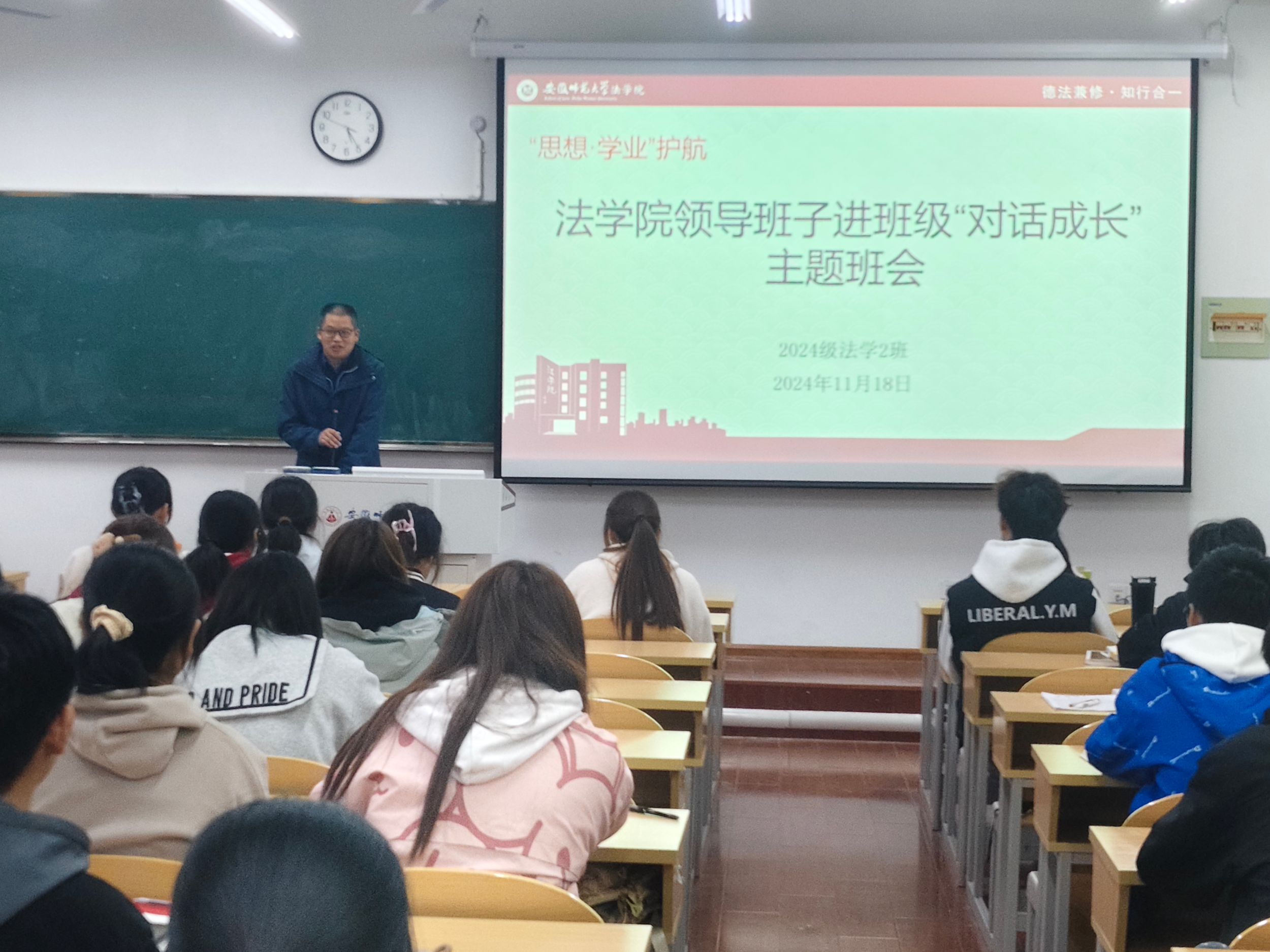 为深入学习贯彻党的二十大精神,扎实推进我校大学生护航行动计划和三全育人工作,落实落细立德树人根本任务,有效发挥“党建+”引领示范作用,推动“下沉一线联系学生工作”机制。11月18日-19日,法学院领导班子成员深入2024级新生班级,开展思想学业护航主题班会。本次交流分享会由各班级班长主持,围绕思想引领、组织建设、文明修身等方面汇报新生班集体建设情况,接着由班级学生代表进行读书分享汇报,最后由院领导班子成员答疑解惑、沟通思想、共话成长。