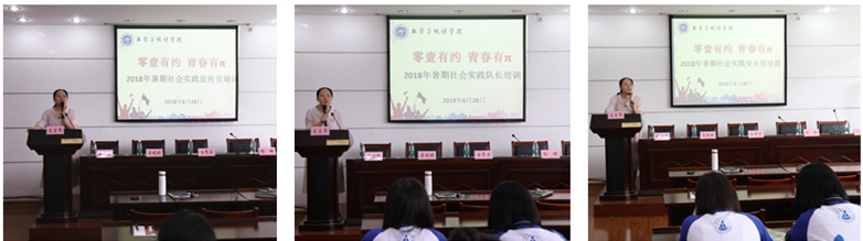 喻娜作总结讲话,她向积极参加暑期社会实践活动的老师和同学们表示最亲切的问候,并向即将奔赴各地实践的同学们提出三点要求:团结协作,形成合力;敢于吃苦,不怕困难;注意安全,严守纪律。与会领导老师分别为重点实践团队代表授旗,并与实践团队队长合影留念。随后院团委副书记李妍就实践团队的队长、宣传员和安全员工作进行了专题培训。