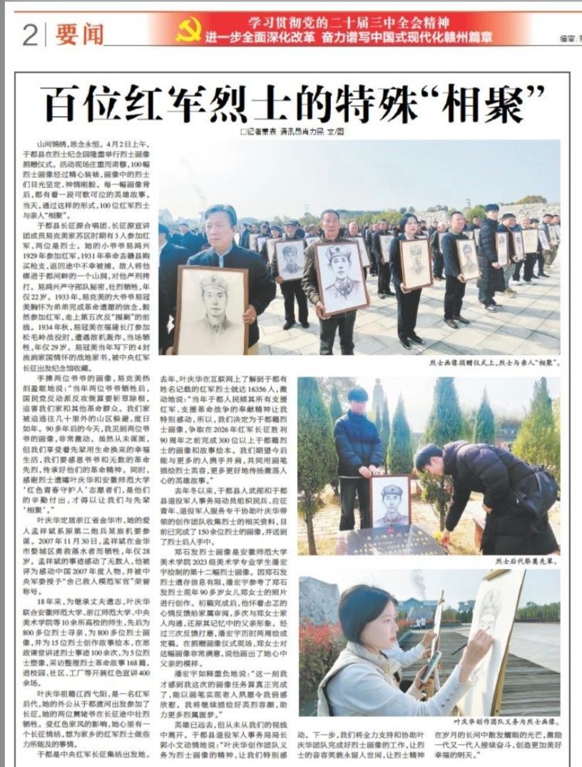 2025年4月2日,在江西于都县举行“赓续·2025·清明祭英烈”暨百位烈士画像捐赠活动上,“红色青春守护人”志愿者团队完成46幅烈士画像的集中捐赠,相关事迹受到中国青年志愿者官微、赣南日报、于都发布等多家主流媒体广泛报道。