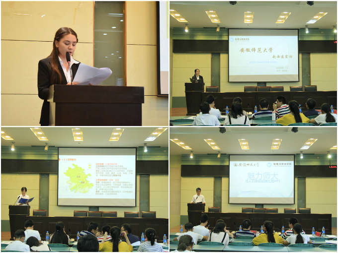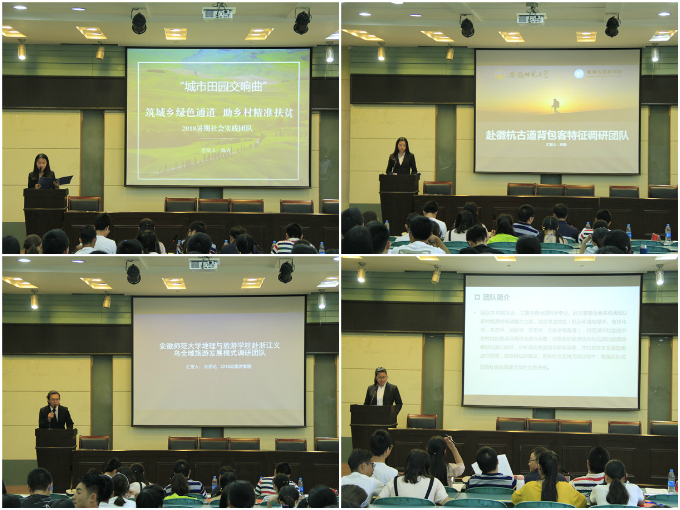 本网讯(地旅学院 赵云飞)为组织引导青年大学生深入学习贯彻习近平新时代中国特色社会主义思想和党的十九大精神,强化实践育人,让学生在社会实践中认识国情、了解社会,增强社会责任感、创新精神和实践能力。地理与旅游学院于2018年6月3日在地旅学院实验楼101报告厅召开2018年暑期“三下乡”社会实践评比答辩会。地理科学专业教师孙鹏副教授、地理信息科学专业教师汪左副教授、院团委副书记吴辉、辅导员陈祥云以及辅导员赵将等出席答辩会,唐婧瑜主持本次会议。