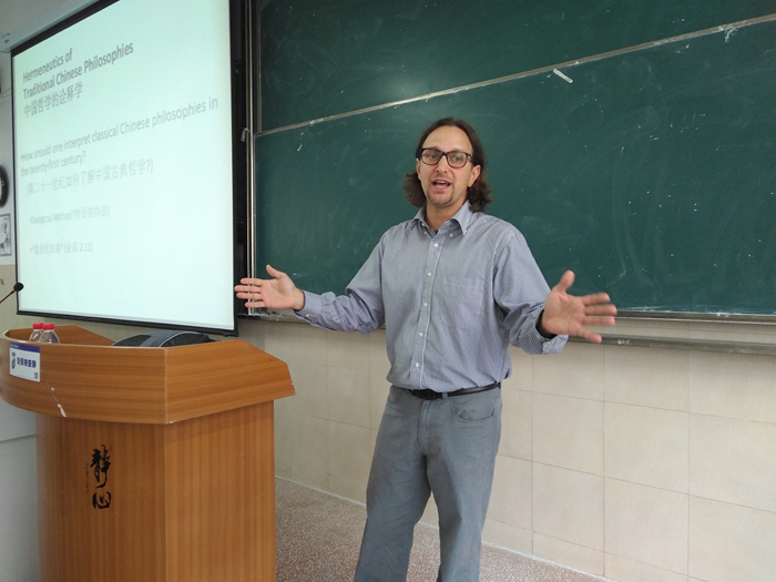 本网讯(文/田皓月 摄/常欣雨)2018年5月23日上午8点,美国阿肯色大学Nicholas Brasovan教授在行知楼2040201教室为马克思主义学院2016级想政治教育专业的本科生带来一场别开生面的外语讲座——宋明理学的生态人文主义。此次讲座由马克思主义学院戴兆国教授主持,部分哲学教研室老师、在读研究生以及高年级本科生参加。
