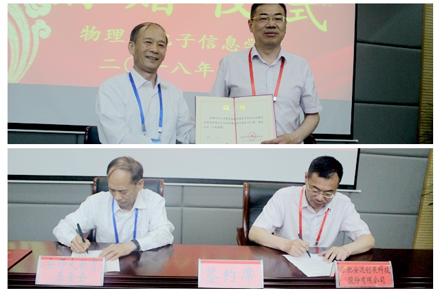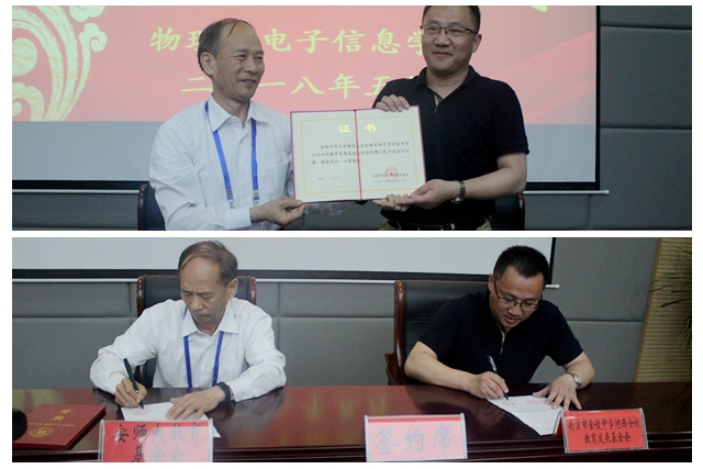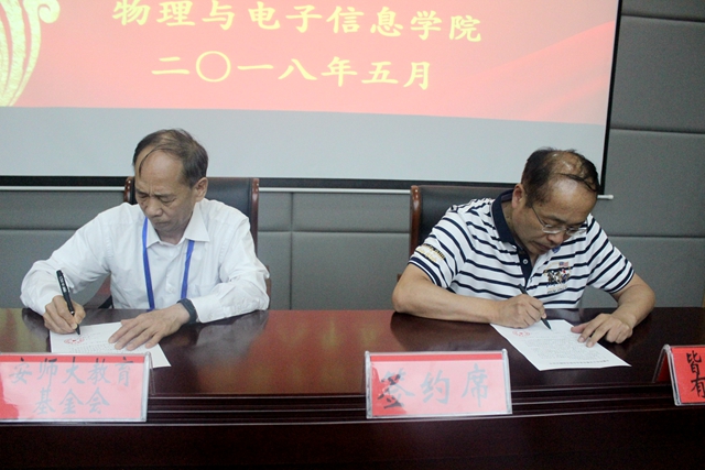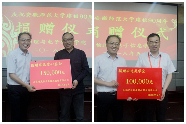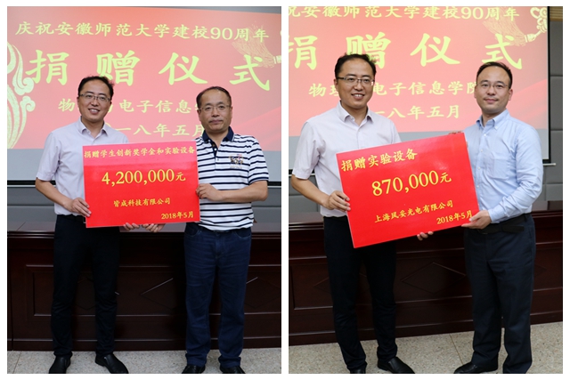 校友发言结束后,捐赠仪式正式开始。安徽师范大学教育基金会秘书长贡植斌分别与南京市金陵中学河西分校教育发展基金会、合肥安达创展科技股份有限公司、皆成科技有限公司代表签约,物电学院党委副书记吴长义代表学院接受以上公司及上海风妥光电有限公司、南京迪威普光电技术股份有限公司捐赠。我院毕业生、南京市金陵中学河西分校校长朱炎先生作为捐赠者代表发言,他对爱心助学基金的设立表示支持与肯定,希望更多的物电人团结合作,为学院发展贡献力量。