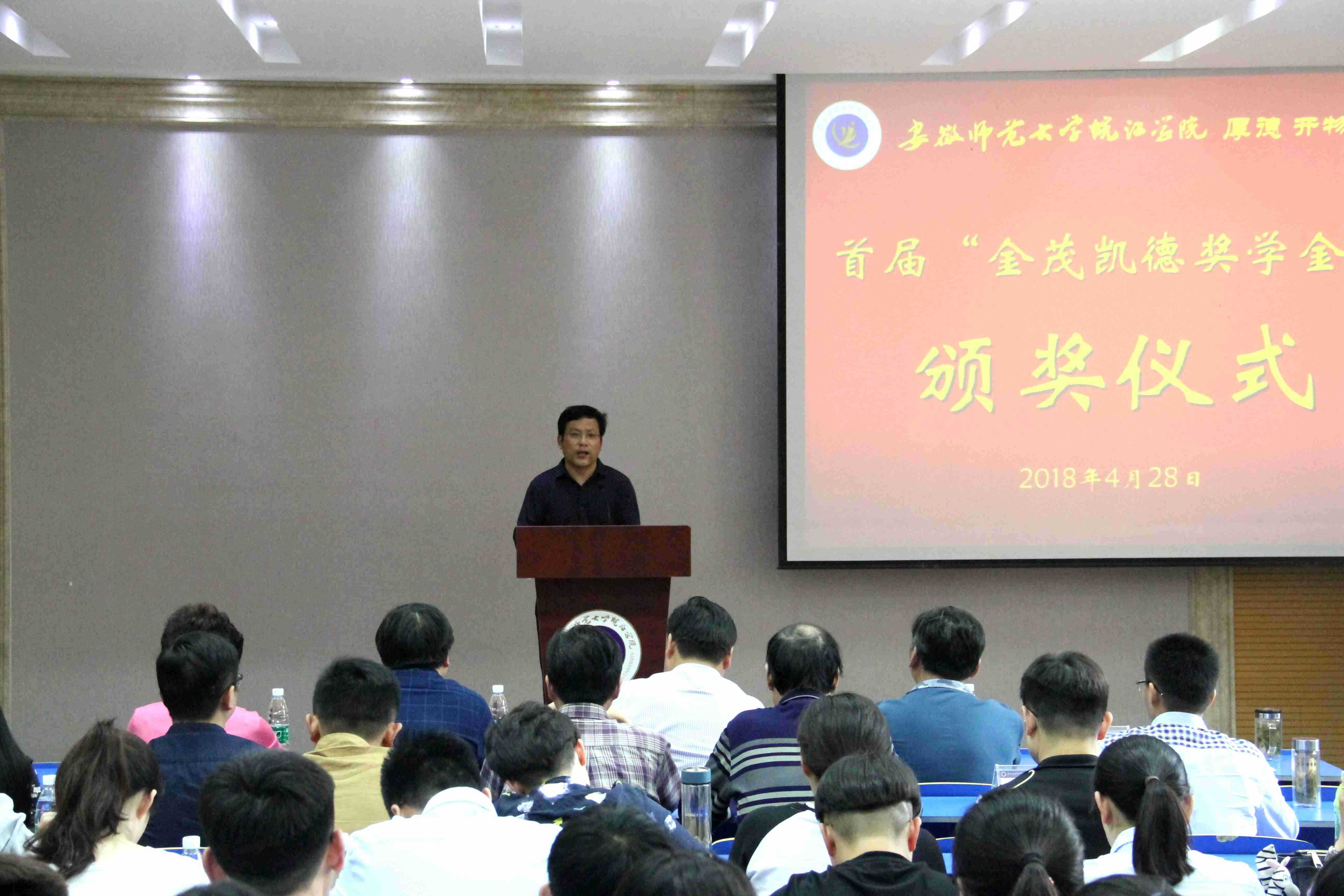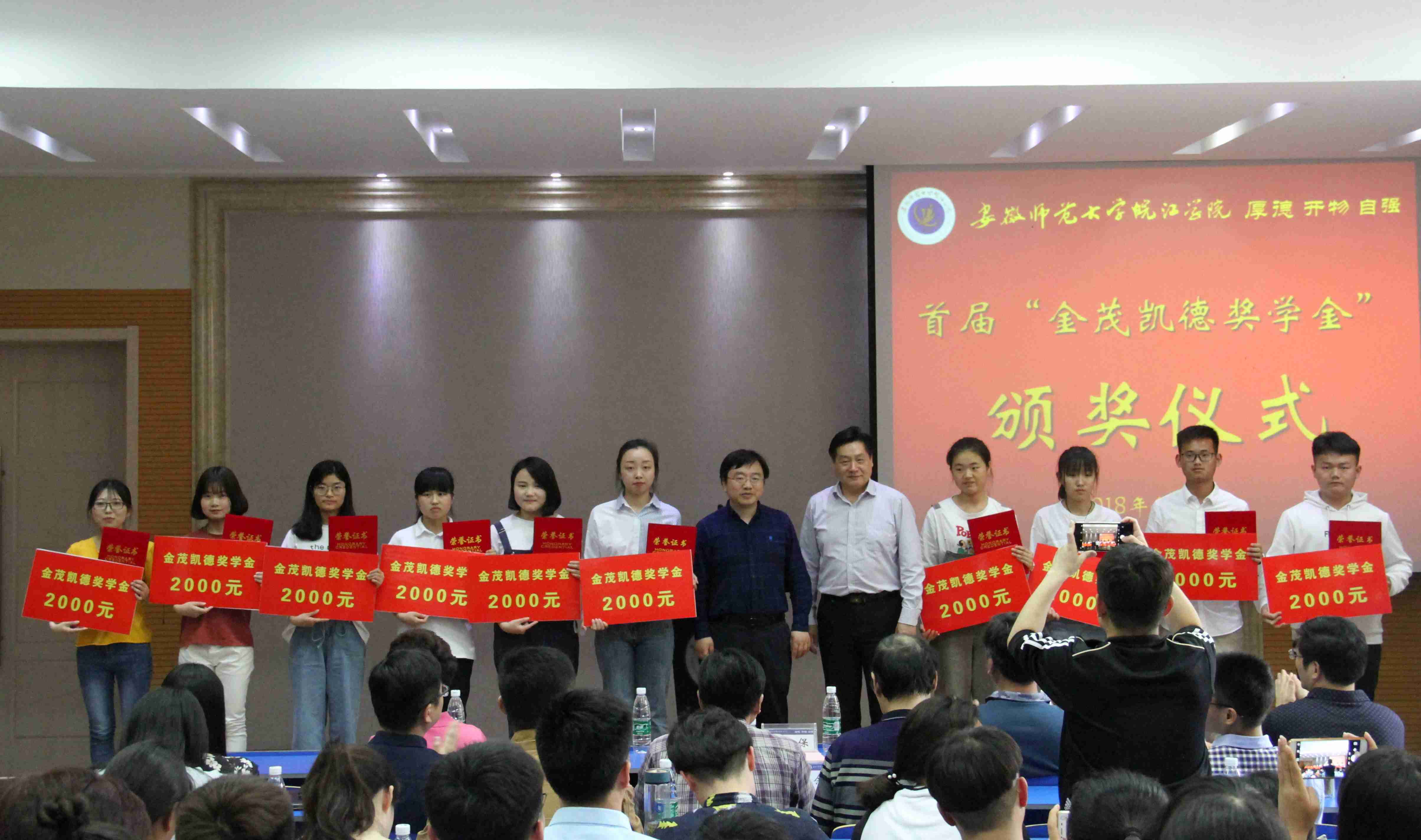 本网讯(皖江学院 鲍淑雯 胡路 虞瑶) 4月28日,皖江学院首届“金茂凯德”奖学金颁奖仪式在皖江校区学术报告厅举行。在院领导、捐助方代表和全院数百名师生的瞩目下,来自学院各系的10名皖江学子手捧荣誉证书和奖金站上领奖台,接受属于他们的掌声和荣誉。