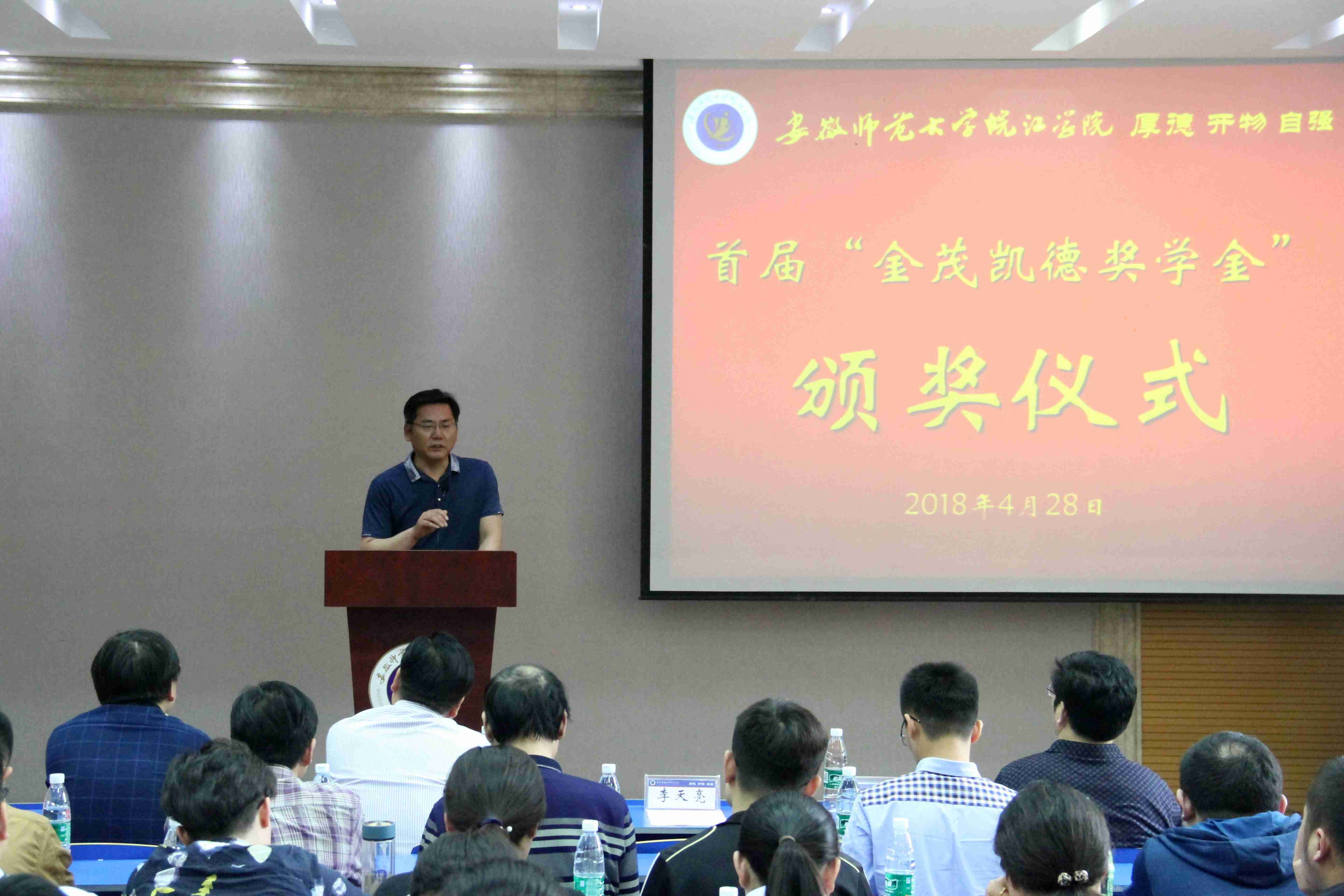 李天亮在致辞中对皖江学院的办学理念和办学成就给予了高度评价。他表示,金茂凯德奖学金的设立,正是为了奖励品学兼优的皖江学子,培养综合素质高,实践能力强的新时代应用技术型人才。他勉励皖江学子树立“终身学习”的理念,把学习作为一种生存状态、生活方式和内在追求,以只争朝夕的精神、滴水穿石的毅力、永不满足的追求,努力学习新知识,不断掌握新本领。