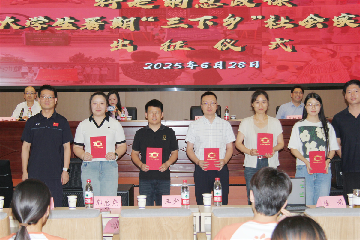 出征仪式在庄严的国歌声中拉开帷幕。丁修真介绍学院暑期社会实践前期工作情况并宣读实践团队名单。杜若菲同学从秉持务实态度、不惧困难挫折、深耕细作实践、实现蜕变精进四个方面分享暑期社会实践经验与感悟。杨乐同学代表志愿者发言,呼吁广大同学深入基层,通过支教、调研、志愿服务等实践过程磨意志、长见识、增才干。范敏在思政指导讲话中深刻阐释教育与社会实践的深层意义,鼓励同学们在暑期社会实践中勇于突破困难,将专业所长转化为服务基层的实际行动,以创新思维点亮实践之路。领导嘉宾依次为暑期社会实践指导教师代表颁发聘书,并为各实践团队代表授旗。