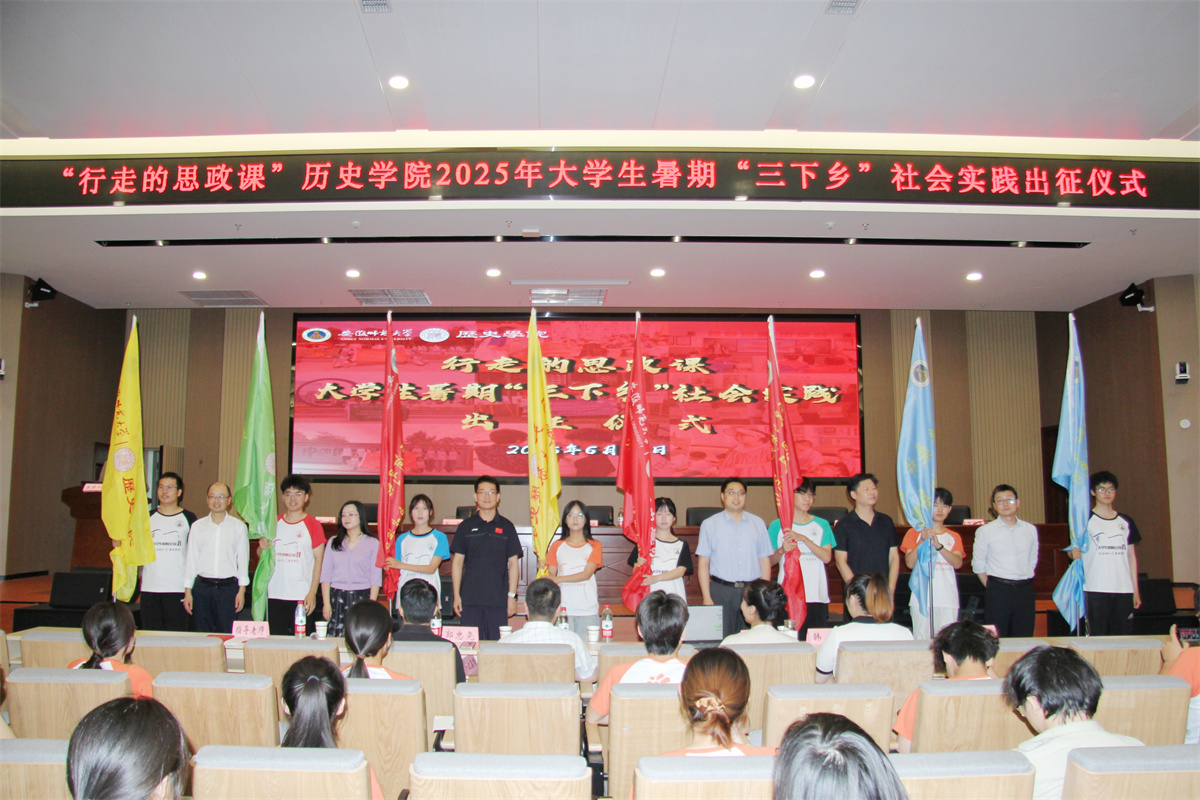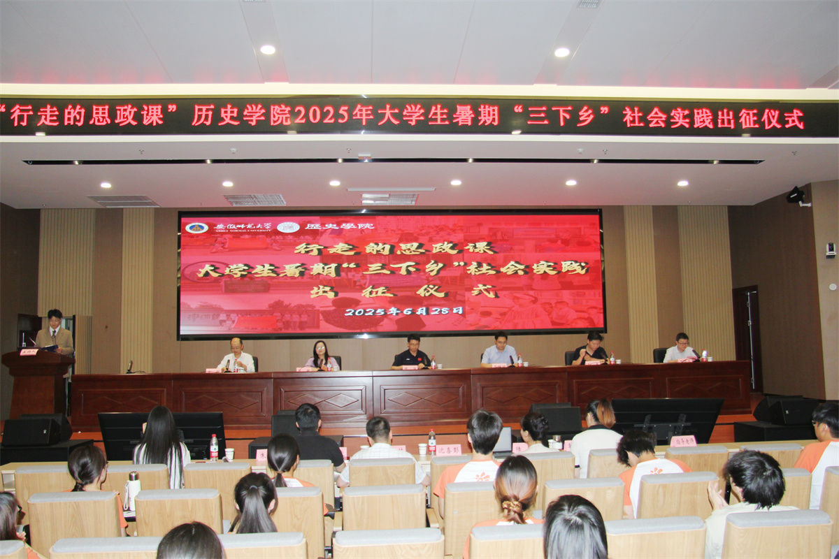 6月28日下午,历史学院在花津校区西侧裙楼三楼报告厅举办“行走的思政课”2025年大学生暑期“三下乡”社会实践出征仪式。校团委书记陈骁,校思政指导教师范敏、刘东,历史学院党委书记廖仲明、党委副书记宫超、副院长丁修真,各团队指导教师代表、辅导员及全体队员参加仪式。
