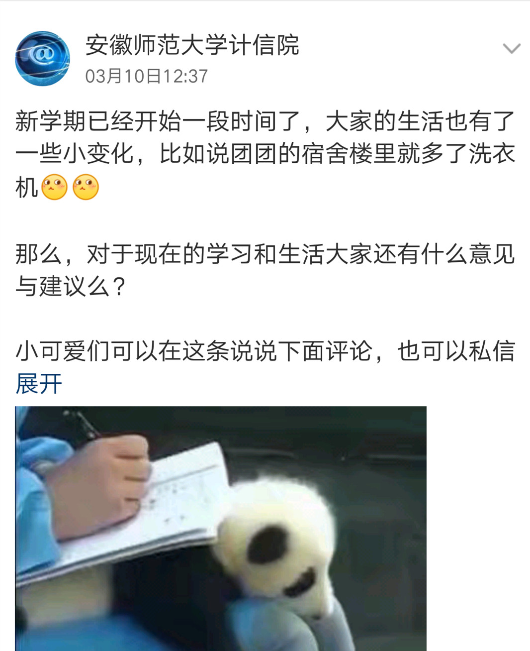 学院进一步推进寝室民主生活会制度,发挥学生“四自”功能,畅通学生诉求途径,多渠道开展思想调研。院学生会通过深入学生宿舍、举办交流会等方式,收集学生意见建议,并集中对学院的教学管理等方面提出建设性意见。辅导员指导各班级通过寝室民主生活会、谈心谈话等方式,及时了解学生关心的热点、焦点问题。学院推进公众服务平台的线上交流,收集同学们关于学习、生活等方面的问题与建议,并进行线上解答。