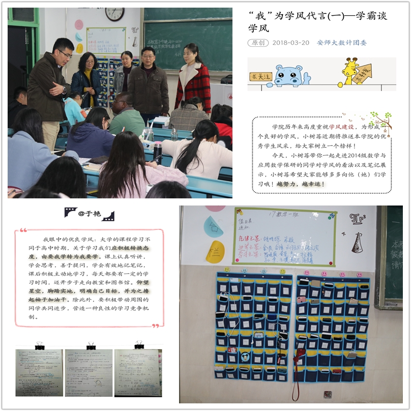 好的习惯能够受益终身。学院坚持实行一年级学生晚自习制度,每周日至周四晚上在固定教室进行自习,辅导员全程监督,帮助低年级同学静下心、沉住气。各班级纷纷实行手机入袋,主动抵制手机诱惑。学院领导不定期对各班级课堂和晚自习情况进行突击检查,督促好习惯的养成。3月13日晚上,学院领导班子全体成员来到教室,检查学生晚自习情况;来到寝室,检查自习时间宿舍情况;来到高等数学部晚间辅导室,看望辅导教师。