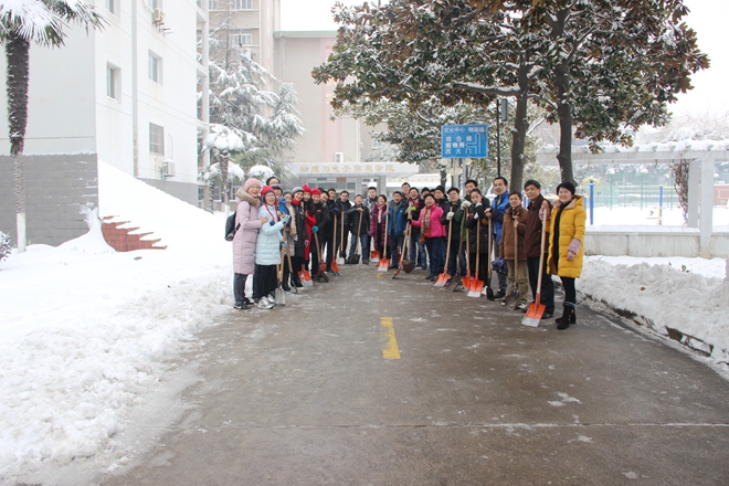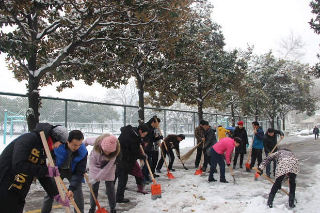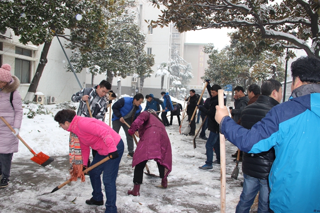 看到自己的劳动成果,老师们感到由衷地欣慰。除雪活动过后,学院张应中老师用一首《铲雪》表达了大家的共同心声:“积雪如棉道上铺,疏通不惜费功夫。铁锹起伏冰分裂,竹帚来回粉扫除。莫使诸人忧失足,欣看百米变通途。廓清待借冬阳力,厚薄全消迹也无。”