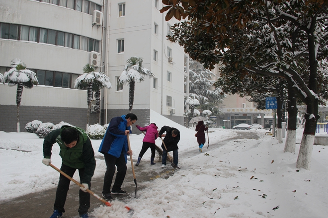 本网讯(文学院 余红梅)近日,芜湖市大雪纷飞,校园内道路积雪严重,给留校师生的工作生活带来诸多不便。1月28日下午,文学院积极响应学校号召,在芜湖的教师们在老校区东大门—校医院—综合楼—生化楼路段开展清除道路积雪和破冰行动。学院办公室准备了铁锹、扫帚等除雪工具,老师们有的还自带了铁锹,大家干得热火朝天,经过两个多小时的共同努力,将道路上的积雪和冰块清除干净,为校园道路的安全畅通提供了保障。