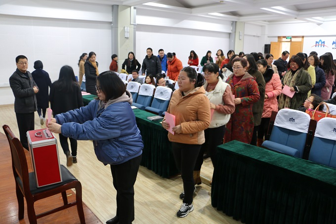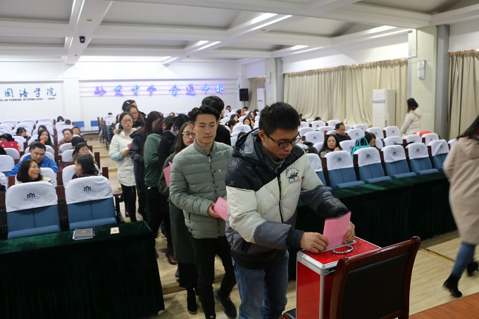 接着,余国升通报了学院增补选校第十次党代会代表候选人的酝酿、推荐和审查等准备工作,并介绍了候选人情况,随后在主持人的指导下、在监票人的监督下,全体正式党员规范填写选票并投下神圣一票。经计票人认真统计,张孝荣老师和胡光倩同学当选为外国语学院参加校第十次党代会代表。