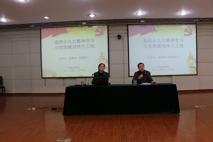 据悉,外国语学院党委高度重视,把党的十九大精神宣讲学习作为学院当前最重要的政治任务,通过召开大会宣讲、党支部专题学习、赴红色教育基地实践教学等形式在全院教工中开展党的十九大精神学习;在党委指导下,通过分党校、“青马工程”团学骨干培训班等平台向学生骨干开展宣讲活动;各学生团支部开展“为中华民族复兴而读书”的主题团日活动,自发学习领会党的十九大精神。外国语学院师生上下宣传十九大、学习十九大的氛围浓厚,广大师生党员自觉运用习近平新时代中国特色社会主义思想指导工作和学习,立足岗位、立足自身,全力以赴做好本职,为学院、学校各项事业发展贡献力量。