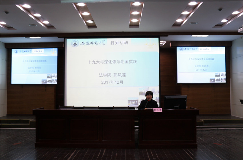彭凤莲教授以《十九大与深化依法治国实践》为题,从十九大报告结构引入,指出报告可大致分为过去五年工作历史性变革、谋划未来蓝图、如何实现蓝图三个部分。在“六个聚焦”部分,彭凤莲教授着重阐明了新时代坚持和发展什么样的中国特色社会主义、怎样坚持和发展中国特色社会主义,并详细领学了“八个明确”、“十四个基本方略”等内容。同时,她指出,中国特色社会主义进入新时代,我国社会主要矛盾已转变为人民日益增长的美好生活需要和不平衡不充分的发展之间的矛盾。在“深化依法治国实践”部分,彭凤莲教授主要从“新时代全面依法治国总目标”、“坚持全面依法治国基本方略及法治进程”、“法治中国建设再部署”等方面展开,她强调,要处理好依法治国与以德治国、依规治党之间的关系,“以我为主、兼收并蓄”,完善以宪法为核心的中国特色社会主义法律体系,建设中国特色社会主义法治体系,建设社会主义法治国家,推进全民尊法学法守法用法。最后,彭凤莲教授谈到,法律追求公平公正、至善至美,希望各位党员能够深入学习领会十九大精神,切实把十九大精神学深悟透,真正把十九大精神内化于心、外化于行。