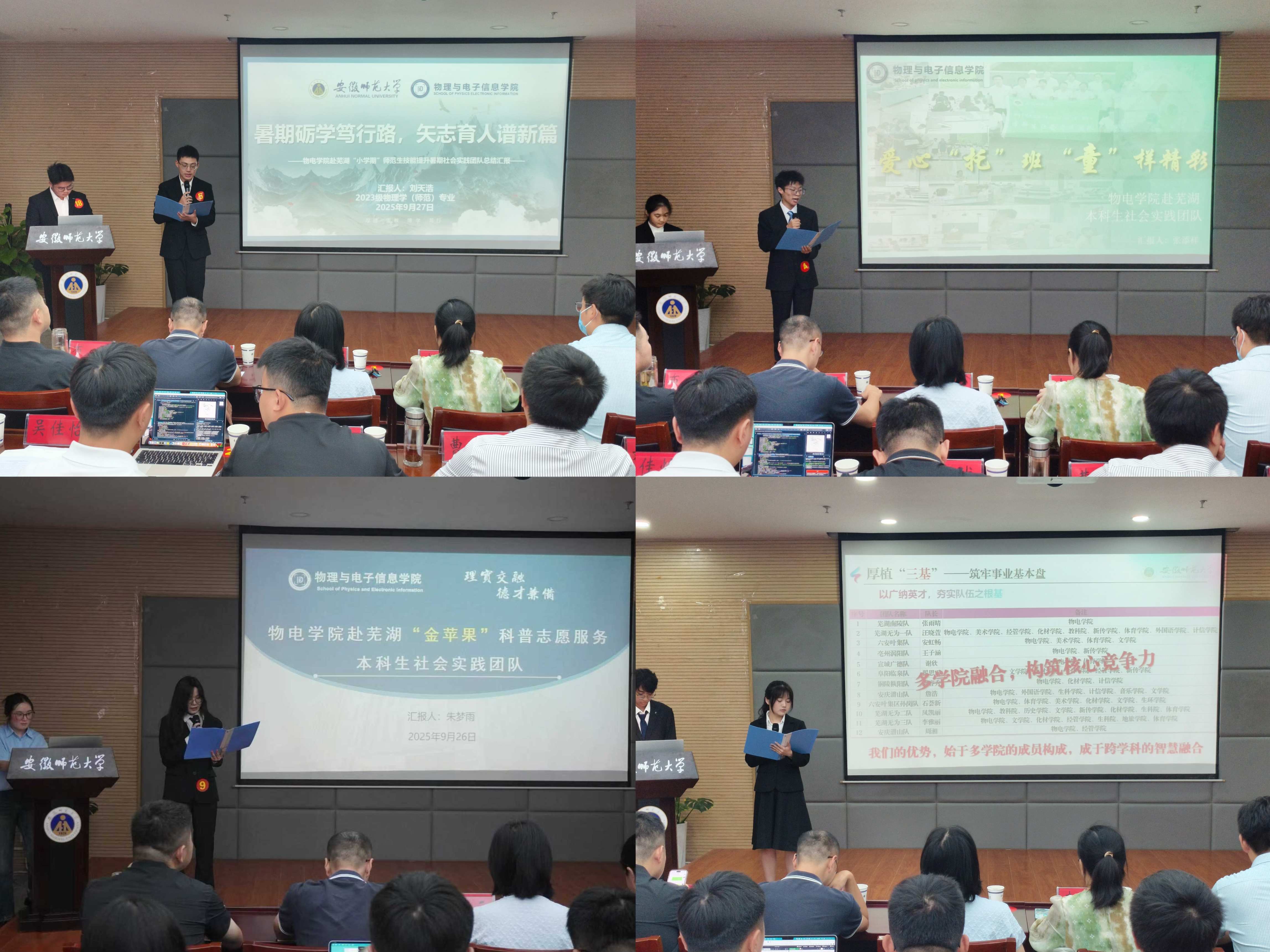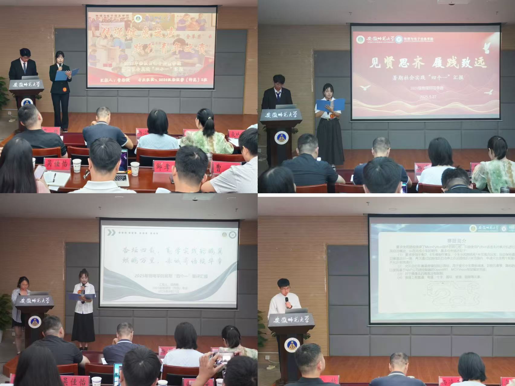 9月27日,物理与电子信息学院在物电楼304报告厅召开2025年暑期社会实践暨假期“四个一”展评交流会。学院党委副书记凌从祥,社会实践思政导师代表李靖,电子信息专业负责人甘露,专业课教师胡长生、杨凌云、张松、吴勇以及全体专兼职辅导员出席活动,各班级、实践团队学生代表到场观摩学习。