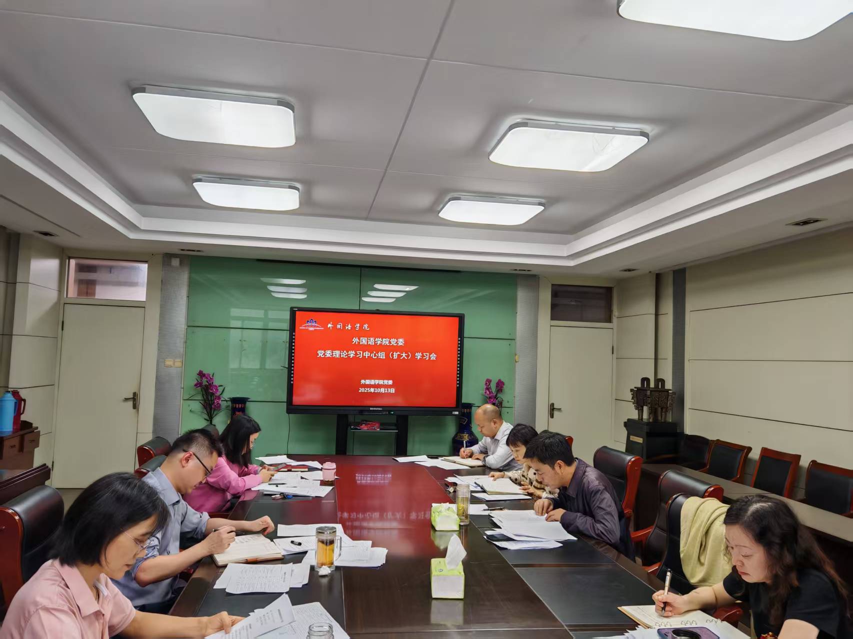 10月13日下午,外国语学院在第一会议室召开党委理论学习中心组(扩大)学习会,深入学习贯彻习近平总书记系列重要讲话精神和《习近平谈治国理政(第五卷)》,学习了中共中央印发的《中国共产党思想政治工作条例》,传达了深入贯彻中央八项规定精神学习教育中央指导组暨中央层面工作专班总结会议精神,解读了《中国共产党纪律检查委员会工作条例》。重点围绕“传承弘扬伟大抗战精神 落实立德树人根本任务”开展专题学习研讨。会议由院党委书记戴和圣主持,学院党委委员、党政班子成员参加。
