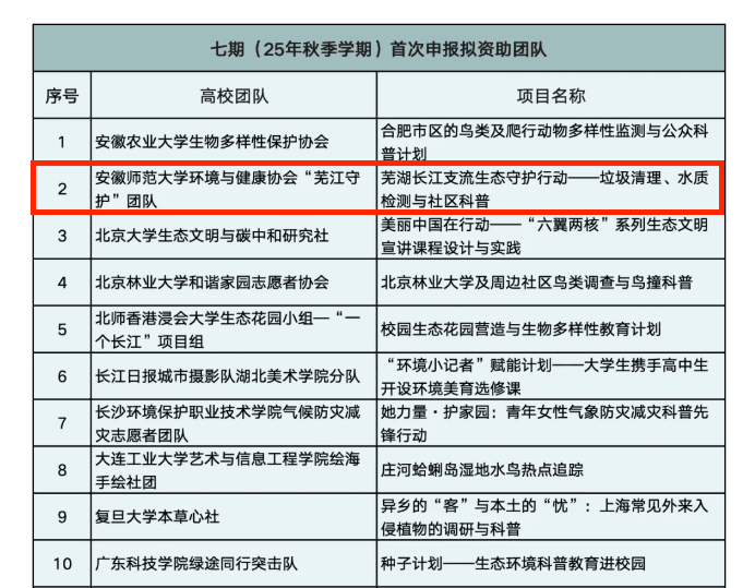 近日,第七期“涓流行动——‘一个长江’大学生环保活动资助计划”名单正式公布,生态与环境学院环境与健康协会、蒲公英环保学校以及2024级生态学专业“水韵长江——重点水生植物保护与传播项目”团队,凭借扎实的前期积累与富有创新性的项目设计,从全国多所高校中脱颖而出,成功获得资助。此次一同入选的还有来自北京大学、复旦大学等高校的共69支团队。截至目前,生态与环境学院已累计五次获得该计划资助,持续展现出生环学子在生态环保领域的专业行动力与社会影响力。